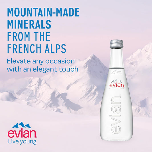 Evian Mineral Water, Naturally Filtered Drinking Water, 330ml Bottled Water Crafted by Nature, Case of 20 x 330ml Glass Water Bottles