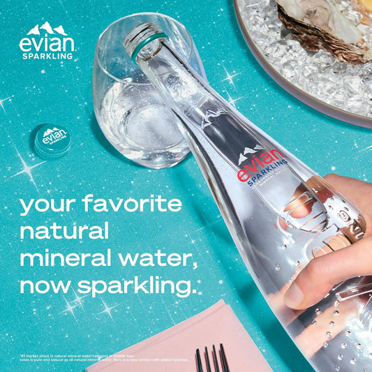 Evian Sparkling Carbonated Natural Mineral Water 750ml Glass Bottle, Case of 12 Bottles, Naturally Filtered Drinking Water, Sparkling Water Crafted by Nature